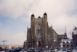 Description :VUE DE LA FACADE DE LA CATHEDRALE. CELLE-CI EST EN PIERRE. A NOTER, LE STATIONNEMENT EST PLEIN D'AUTOMOBILE. A L'ARRIERE-PLAN, A GAUCHE, LE CEGEP.