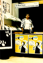 Description :1.1 - DENYS CARON DERRIERE LE KIOSQUE DU THEATRE ENTRE CHIEN ET LOUP. SUR L'AVANT DE LA TABLE, DEUX AFFICHES DE LA PIECE "LOTO-CLIP". EN HAUT DE LA TABLE, UNE PANCARTE AVEC L'INSCRIPTION "LA BEDE TROUEE PLUS QU'UN DIVERTISSEMENT: UN OUTIL PEDA...