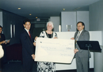 Description :1.1 - MARIO LAVOIE, CAROLINE PAQUETTE ET PAUL THEBERGE TIENNENT UN CHEQUE FORMAT GEANT D'UNE VALEUR DE 5000$. 1.2 - ALBERT GREGOIRE PARLE A L'ARRIERE D'UN LUTRIN. A SA GAUCHE, PAUL THEBERGE ET CAROLINE PAQUETTE. A DROITE, UN TABLEAU SUR UN MUR...