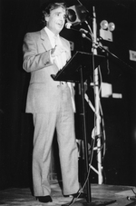 Description :GROS PLAN DE JEAN BESRE EN TRAIN DE PARLER AU MICRO. DEVANT LUI, UN LUTRIN. EN ARRIERE-PLAN, UN PROJECTEUR.
