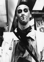 Description :GROS PLAN SUR MARIO TREPANIER DEGUISE EN MONSIEUR DE LA VIRGULE. IL PORTE UNE VESTE ET UN FOULARD. IL EST MAQUILLE.