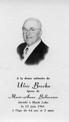 Notes :ULRIC BROCHU ETAIT L'EPOUX DE MARIE-ANNA BELLANCE. IL EST DECEDE LE 13 JUIN 1961 A BLACK LAKE.