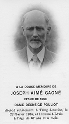 Notes :JOSEPH AIME GAGNE ETAIT L'EPOUX DE FEUE DESNEIGES POULIOT. IL ETAIT AUSSI L'ONCLE DE CARMEN. IL EST MORT LE 22 FEVRIER 1935 A TRING JONCTION.