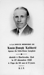 Notes :LOUIS-JOSEPH LALIBERTE ETAIT L'EPOUX DE JULIE-ANNA LANGLOIS. IL EST DECEDE A SHERBROOKE LE 27 DECEMBRE 1949. C'ETAIT LE FILS DE GEORGES LALIBERTE ET DE MARIE DESANGES FORTIER.