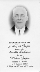 Notes :ALFRED GAGNE ETAIT L'EPOUX DE LUCETTE LACHANCE ET LE FILS DE WILLIAM GAGNE. IL ETAIT L'ONCLE DE CARMEN. IL EST MORT LE 1 JANVIER 1953 A LEVIS.