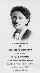 Notes :JULIETTE CARBONNEAU ETAIT LA FILLE DE J.O. CARBONNEAU ET HELOISE GAGNE. ELLE ETAIT LA COUSINE DE CARMEN. ELLE EST DECEDEE LE 29 NOVEMBRE 1940 A L'HOTEL-DIEU DE LEVIS.