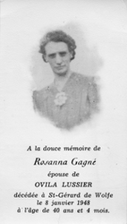 Notes :ROSANNA GAGNE ETAIT L'EPOUSE D'OVILA LUSSIER. ELLE DEVAIT ETRE PARENTE AVEC CARMEN. ELLE EST DECEDEE LE 8 JANVIER 1948 A ST-GERARD DE WOLFE.