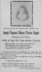 Sujet principal :JOSEPH FRANCOIS ESDRAS FLORIAN GAGNE, DECEDE A L'AGE DE 7 ANS
