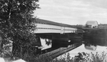 Description :VUE DE BIAIS DU PONT COUVERT DE NOTRE-DAME-DES-PINS. LE PONT A QUATRE SECTIONS. UNE LIGNE ELECTRIQUE SUR LE COTE TRAVERSE AUSSI LA RIVIERE CHAUDIERE. FERME EN ARRIERE-PLAN.