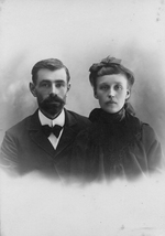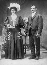 Description :PORTRAIT DE PIED EN CAP D'EMMA GAGNE ET DE ROMEO DESLONGCHAMPS. ALORS QU'EMMA PORTE UNE ROBE LONGUE ET UN CHAPEAU, SON MARI PORTE UN HABIT ET UN NOEUD PAPILLON.