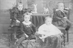 Description :PORTRAIT STUDIO DE GROUPE. LES ENFANTS SONT ASSIS DEVANT UNE TABLE. BEAU DECOR. LE BEBE EST NU-PIEDS.