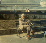 Description :EUCLIDE DECOSTE EST ASSIS SUR UN BANC VERT. IL PORTE UN HABIT, UNE CRAVATE ET DES LUNETTES. IL TIENT DANS SES MAINS SON MANTEAU. A GAUCHE, UNE CANNE. EN ARRIERE-PLAN, DES GENS ET UN BATIMENT.