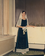 Description :PORTRAIT DE PIED EN CAP. ELLE PORTE SA ROBE DE MARIAGE: UNE ROBE VERTE EN VELOURS AVEC BORDURE DE DENTELLES BLANCHES AU BAS SEULEMENT. ELLE A LA MEME DENTELLE COMME VOILE SUR LA TETE (VISAGE DEGAGE). ELLE TIENT UN BOUQUET DE FLEURS BLANCHES A ...