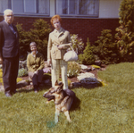 Description :ROBERT LEMIRE, ODETTE ? ET AURETTE LEMIRE DEVANT DE LA VEGETATION PLACEE AUTOUR D'UNE MAISON. EN AVANT-PLAN, UN BERGER ALLEMAND.