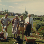 Description :MARC-ANDRE FORTIER ET SA TONDEUSE, GRATIA FORTIER AVEC UNE CANNE, DENISE LADOUCEUR (EPOUSE DE MARC-ANDRE) ET ROBERT LEMIRE. DEVANT EUX, UN CHIEN DU NOM DE FRITH ET UNE PETITE BROUETTE AVEC DU GAZON. EN ARRIERE-PLAN, DES MAISONS.