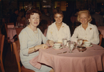 Description :AURETTE A GAUCHE ASSISE A UNE TABLE AVEC DEUX AUTRES FEMMES. ELLES REGARDENT LA CAMERA. SUR LA TABLE: NAPPE ROSE, VERRES D'EAU ET TASSES. SALLE A MANGER EN ARRIERE-PLAN.