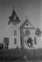 Description :EGLISE AVEC UNE TOUR CARREE A GAUCHE SE TERMINANT PAR UN TOIT EN PIGNON. A DROITE, L'ENTREE PRINCIPALE SURMONTEE D'UN TOIT. EN AVANT-PLAN, DE L'HERBE ET DES HOMMES.
