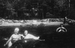 Description :1.1 - A GAUCHE, CARMEN DECOSTE ASSISE SUR UN TUBE PNEUMATIQUE AVEC DEUX AUTRES BAIGNEUSES DANS L'EAU. ELLES PORTENT TOUTES DES CASQUES DE BAIN. A DROITE, UNE AUTRE BAIGNEUSE SUR UN TUBE PNEUMATIQUE (CHAMBRE A AIR). EN ARRIERE-PLAN, PLAGE ROCAI...