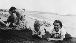 Description :2.1 - IDA GOYETTE ETENDUE SUR LE VENTRE SUR UNE COUVERTURE UN SUCON EN MAIN. A SA DROITE, UN JEUNE GARCON DANS LA MEME POSITION AUSSI AVEC UN SUCON. A GAUCHE, DEUX AUTRES FEMMES ASSISES SUR UNE AUTRE COUVERTURE. EN ARRIERE-PLAN, CHAMP, CHEMIN...