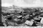 Description :VUE A VOL D'OISEAU DES INSTALLATIONS DE LA MINE A PARTIR DE L'EGLISE ST-ALPHONSE DONT ON APERCOIT UN COIN DE TOIT. QUARTIER RESIDENTIEL A L'AVANT-PLAN. RESIDUS DE MINE DISTRIBUES EN AMAS A QUELQUES ENDROITS.