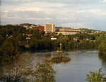 Description :VUE DU CEGEP A PARTIR DU CIMETIERE ST. PETERS. ON VOIT LE PAVILLON ADMINISTRATIF, LES RESIDENCES, LE PAVILLON DES SCIENCES ET CELUI DES SCIENCES HUMAINES. EN FACE, LA RIVIERE ST-FRANCOIS ET L'ILOT MENA'SEN AVEC SA CROIX.