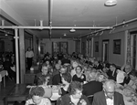 Description :LES INVITES AU BANQUET SONT ATTABLES ET SOUPENT. LES FEMMES PORTENT DES CORSAGES DE FLEURS. LA SALLE, TOUTE EN LONGUEUR, OFFRE UN ASPECT STANDARD: LA PLOMBERIE EST APPARENTE AU PLAFOND ET AUX MURS.