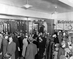 Description :4.1 - GROS PLAN DE L'ENTREE INTERIEURE AU CLUB BELLEVUE. DECORATION DE NOEL COMPRENANT GUIRLANDES ET CLOCHES. A DROITE, COMPTOIR DE DISTRIBUTION DE DOUCEURS DERRIERE LEQUEL SE TIENNENT QUATRE PREPOSES VETUS DE VESTE BLANCHE. DEVANT ENFANTS ET ...