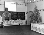 Description :7.1 - VUE D'UNE PARTIE DU PETIT THEATRE. LE DECOR EST CONSTITUE DE DEUX TABLES RECOUVERTES DE NAPPES DE NOEL ET D'ACCESSOIRES, D'UN FAUX FOYER, D'UN SAPIN DE NOEL ET DE GUIRLANDES TORSADEES. 7.2 - GROS PLAN D'UNE TABLE FLANQUEE DE DEUX SAPINS ...