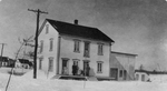 Description :VUE D'UNE MAISON EN BOIS DE DEUX ETAGES ET DEMI. CETTE DERNIERE COMPTE DE NOMBREUSES FENETRES. DEVANT LA MAISON, UN PERRON SUR LEQUEL IL Y A DEUX HOMMES ET DEUX ENFANTS. A GAUCHE, UN POTEAU ELECTRIQUE. A DROITE, UN BATIMENT QUI PEUT SERVIR D'E...