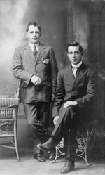 Description :A GAUCHE, UN HOMME ROUX DEBOUT, BRAS DROIT SUR DOSSIER D'UNE CHAISE DE ROTIN. A DROITE, UN HOMME ASSIS JAMBES CROISEES SUR UNE AUTRE CHAISE DE ROTIN. IL S'AGIT PROBABLEMENT DE DEUX FRERES.