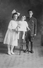 Description :PORTRAIT STUDIO. AURETTE (10 ANS) DEBOUT A GAUCHE ACCOUDEE SUR UN TABOURET OU EST ASSISE CARMEN (2 ANS). ROBERT LEMIRE (12 ANS) A DROITE.