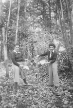 Description :3.1 - CARMEN DECOSTE A GAUCHE, FUSIL DE CHASSE EN MAIN. LE FUSIL EST APPUYE SUR LE SOL. THERESE VERRETTE A DROITE. ELLES TIENNENT UN CANARD ENTRE ELLES POUR MONTRER LEUR PRISE. FORET EN ARRIERE-PLAN. 3.2 - PHILIPPE VERRETTE A GAUCHE, FUSIL DE ...