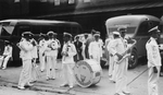 Description :1.1 - PLUSIEURS MEMBRES DE L'HARMONIE AVEC LEUR INSTRUMENT DEVANT 2 AUTOBUS. AU CENTRE, LE GROS TAMBOUR PORTANT L'INSCRIPTION "L'HARMONIE DE SHERBROOKE" EST POSE SUR LE SOL. LA SCENE EST PRISE A LA GARE D'AUTOBUS RUE LANSDOWNE. 1.2 - MEME SCEN...