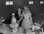 Description :RICHARD ET HELENE PLANTE POSES EN HABITS DE NOCES ALORS QU'ILS COUPENT LEUR GATEAU DE MARIAGE.