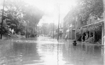 Description :PHOTO PRISE A PARTIR DU COIN DE LA RUE CONSEIL. A DROITE, L'EDIFICE DU 35 BOWEN SUD AVEC SA GALERIE COUVERTE DE LIERRE. UNE BORNE FONTAINE DEVANT EST PARTIELLEMENT SOUS L'EAU. VUE DES MAISONS DE BIAIS JUSQU'A LA RUE JUBILEE. UN HOMME EST DANS ...