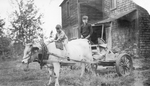 Description :BOEUF ATTELE A UN CHAR. UN JEUNE GARCON EST MONTE SUR LE DOS DU BOEUF ET TIENT LES RENES. DERRIERE, UN AUTRE GARCON PLUS VIEUX EST SUR LE CHAR. CE DERNIER SEMBLE DE FABRICATION ARTISANALE ET A DES PNEUS D'AUTOMOBILE. EN ARRIERE-PLAN, UNE DEMEU...