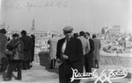 Description :PORTRAIT A PARTIR DES GENOUX. PLUSIEURS PERSONNES EN ARRIERE LE LONG D'UN MURET DE PIERRE. VUE SUR LA VILLE EN ARRIERE-PLAN.