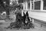 Description :ULRIC BROCHU DEVANT L'ENTREE DE SA MAISON. A L'AVANT, DES ANIMAUX EMPAILLES. PARMI CEUX-CI, UN RENARD, UN CERF, UN OISEAU RAPACE ET DEUX RATONS LAVEURS. EN ARRIERE-PLAN, UNE CLOTURE ET UNE MAISON.