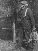 Description :STANISLAS FORTIER DE PROFIL. IL TIENT PLUSIEURS PERDRIX DANS SA MAIN GAUCHE ET SON FUSIL DANS SA MAIN DROITE. FORET EN ARRIERE-PLAN.