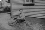 Description :8.1 - STANISLAS ASSIS SUR LE SOL DEVANT UN MUR DU CHALET. IL A UNE CARTE GEOGRAPHIQUE EN MAIN. IL PORTE DES BOTTES EN CAOUTCHOUC HAUTES JUSQU'AUX GENOUX. 8.2 - MEME PHOTO AGRANDIE ET INVERSEE.