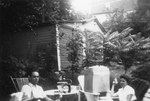 Description :THERESE GOYETTE ET PHILIPPE VERRETTE ASSIS SUR DES CHAISES DE PARTERRE. EN ARRIERE-PLAN, DE LA VEGETATION ET UNE CABANE.