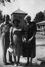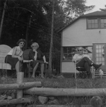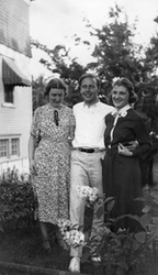 Description :GRATIA FORTIER AU CENTRE AVEC A SA GAUCHE, MADAME FORTIN ET A SA DROITE, MONSIEUR FORTIN. EN ARRIERE-PLAN, LE CHALET DE CARMEN ET EUCLIDE DECOSTE.