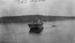 Description :GRATIA FORTIER ET SON JEUNE FILS MARC-ANDRE SONT DANS UNE CHALOUPE. GRATIA TIENT UNE RAME. EN ARRIERE-PLAN, LA RIVE SUR LAQUELLE IL Y A DES ARBRES.