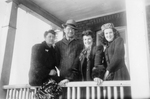 Description :CARMEN DECOSTE, EUCLIDE DECOSTE ET DEUX FEMMES SUR UN PERRON. DEVANT EUX, LA GARDE DU PERRON. A NOTER, LES INDIVIDUS PORTENT TOUS UN MANTEAU D'HIVER.