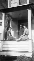 Description :27.1 - PORTRAIT DE GROUPE DE PIED EN CAP DEVANT UNE RESIDENCE. CARMEN AU CENTRE TIENT PAR LA TAILLE MARC-ANDRE FORTIER EN COSTUME MILITAIRE ET EUCLIDE DECOSTE. 27.2 - PORTRAIT DE GROUPE DE PIED EN CAP DEVANT UNE RESIDENCE. DE GAUCHE A DROITE, ...
