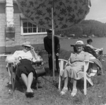 Description :GRATIA FORTIER ET UNE AMIE ASSISES DANS DES CHAISES EN BOIS SOUS UN PARASOL. GRATIA PORTE UNE JUPE, UNE CHEMISE, UN CHAPEAU, DES LUNETTES ET UNE CANNE. EN ARRIERE-PLAN, A GAUCHE, UN HOMME ET UNE MAISON. A DROITE, UNE FEMME ASSISE DANS UNE CHAI...