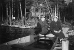 Description :CARMEN DECOSTE ET GISELE LOISELLE SONT ASSISES AU BOUT D'UN BATEAU. CE DERNIER EST PLACE SUR LE QUAI. EN ARRIERE-PLAN, LE LAC BROMPTON ET LE CHALET DE CARMEN SUR LA RIVE.