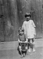 Description :CARMEN DEBOUT DERRIERE. ELLE A LA MAIN SUR L'EPAULE DE MARC-ANDRE ASSIS SUR UN TRICYCLE EN BOIS. EN ARRIERE-PLAN, GARAGE OU REMISE EN BOIS. CARMEN A 8 ANS ET MARC-ANDRE A 4 ANS.