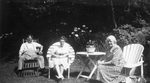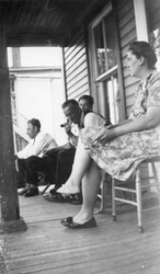 Description :CARMEN FORTIER EN AVANT-PLAN COTE DROIT ASSISE SUR UNE CHAISE EN BOIS. VUE DE BIAIS TROIS HOMMES SONT AUSSI SUR LA GALERIE. PLANCHER DE LA GALERIE EN LATTES DE BOIS. FENETRE DE LA MAISON ET PORTE EN PARTIE VISIBLE.