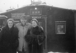 Description :34.1 - EUCLIDE TIENT CARMEN, A GAUCHE, ET AURETTE GAUVREAU, A DROITE, PAR LES EPAULES. ILS PORTENT TOUS UN MANTEAU. A L'ARRIERE-PLAN, UNE CABINE AVEC LES AFFICHES: "JACQUES CANOUETTE, CABANES DE PECHE A ... ICI TEL 2...", "BUREAU " ET "LES BON...